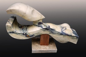 Deze marmeren sculptuur combineert strakke en vrije vormen die elkaar verdragen en versterken.